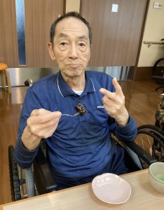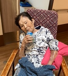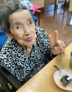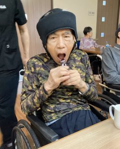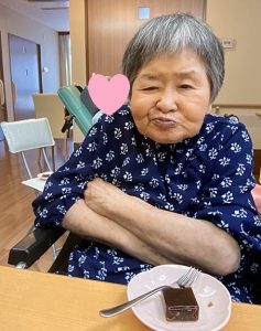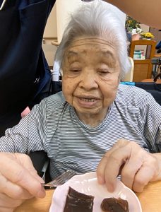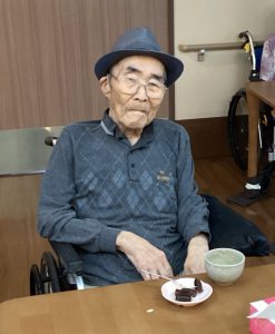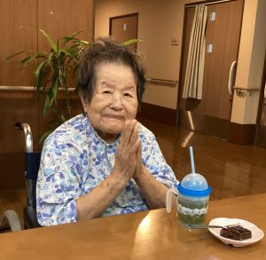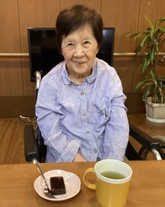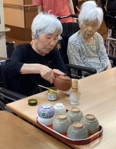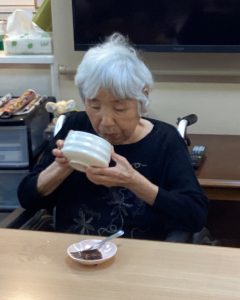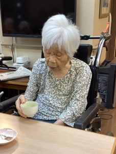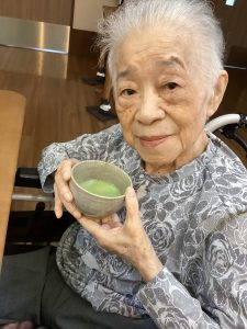 9月15日(月)敬老の日、ユニット2階虹のまち・心のまちでお茶会&敬老会を開催いたしました。お茶会ではご利用者様I様がたてた美味しい抹茶と羊羹をみんなで美味しく頂き、敬老会では職員の感謝の気持を込めたメッセージカードをプレゼントさせて頂きました。最後に記念撮影をしました。