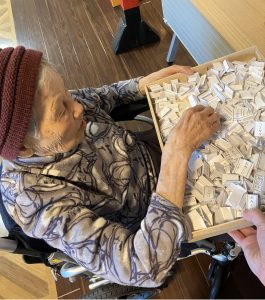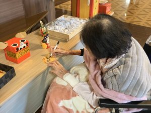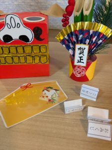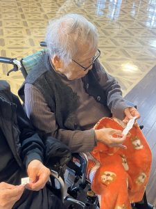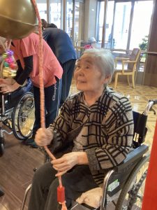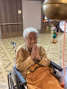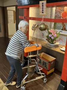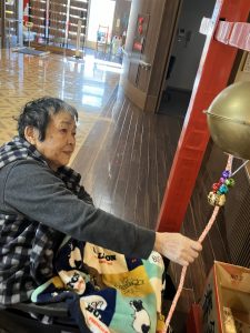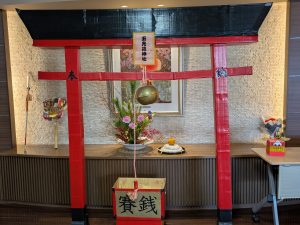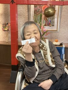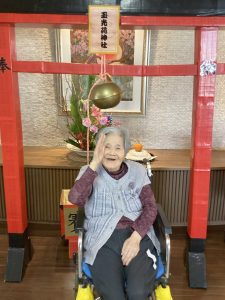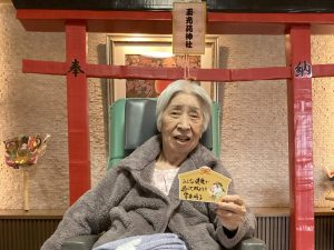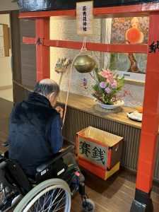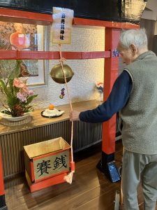 今年も玉光苑神社に参拝し2026年のスタートです。玄関エントランスに玉光苑神社の登場です。鳥居に賽銭箱にお賽銭、おみくじ、絵馬 全て職員の手作りです。暖かい苑内でもお正月気分を存分に味わって頂きました。皆様神社に参拝し手を合わせられ、思い思いのお願いごとを絵馬に書いたり、おみくじを引いて歓喜したり 午年の2026年に思いを馳せていらっしゃいました。